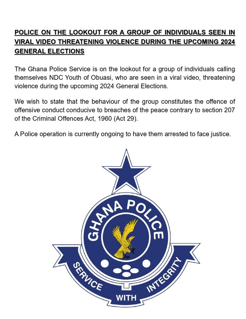 The Ghana Police Service has launched a manhunt for members of a group identifying as the “NDC Youth of Obuasi” after they were seen in a viral video making violent threats ahead of the 2024 Polls.
