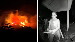 “Please God, please God save us, save our house. Please God, please,” he says in one – the whole sky now glowing yellow-orange. Sirens echo around him.